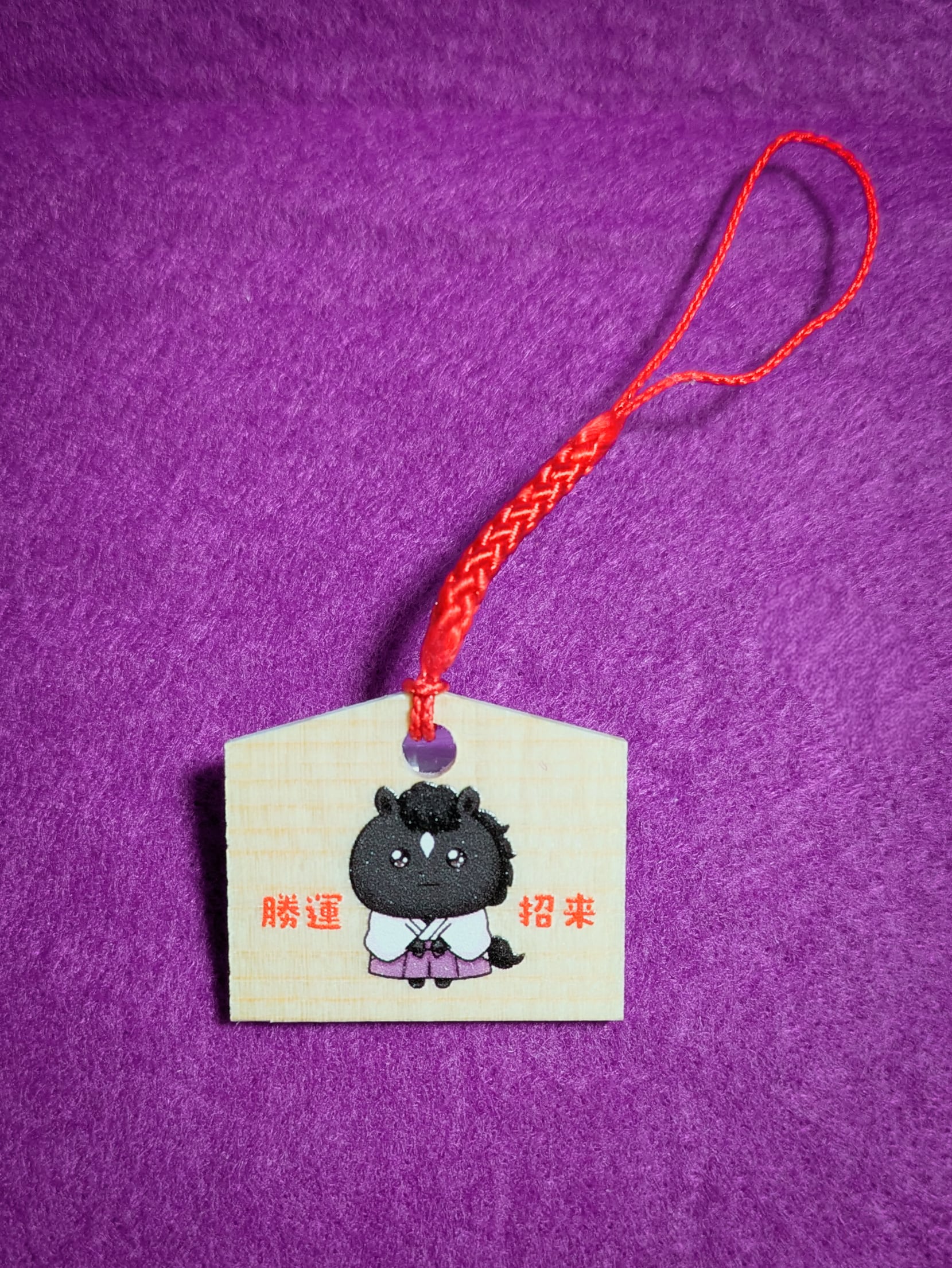 当神社の公式キャラクター・ホギホギ(馬です)をデザインした「勝運招来祈願」の絵馬です。 当神社に建立された「馬魂祈勝の祠」に祀られている名馬たちから勝運を授かれるように祈りを込めました。